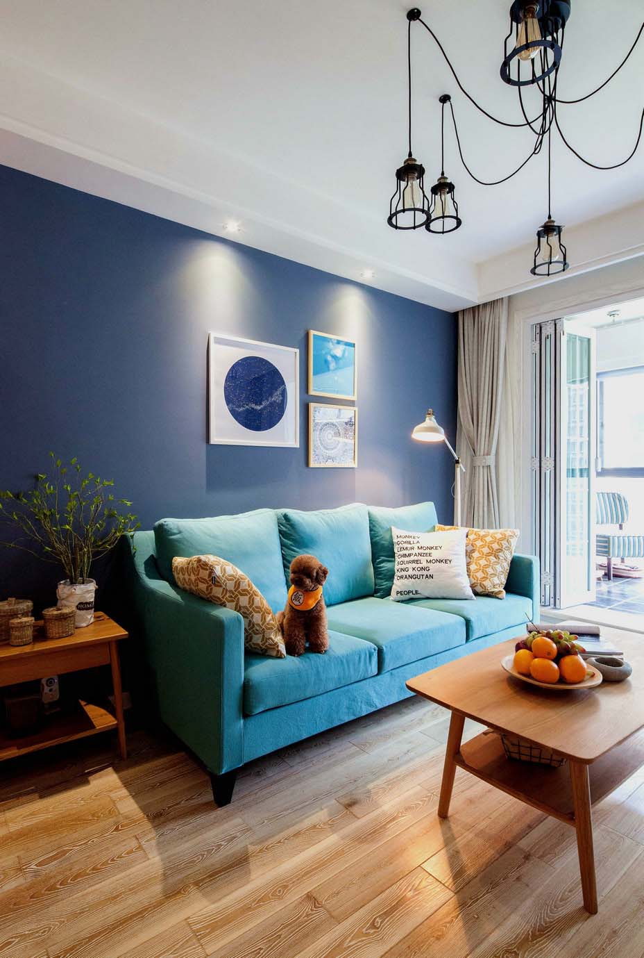 这是一套颜色稍显艳丽的北欧风格,沙发背景墙是深蓝色,沙发是天蓝色,电视背景墙是原木姜黄色,色彩相对而言是比较艳丽浓重的,但是墙顶面只是简单的处理,地板也是低调的颜色,所以整体北欧感觉还是比较重的。