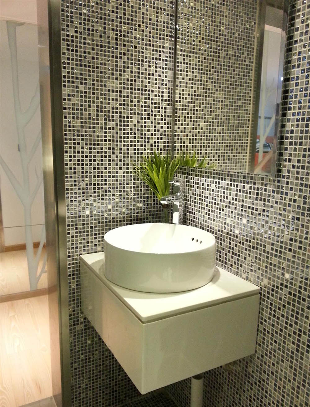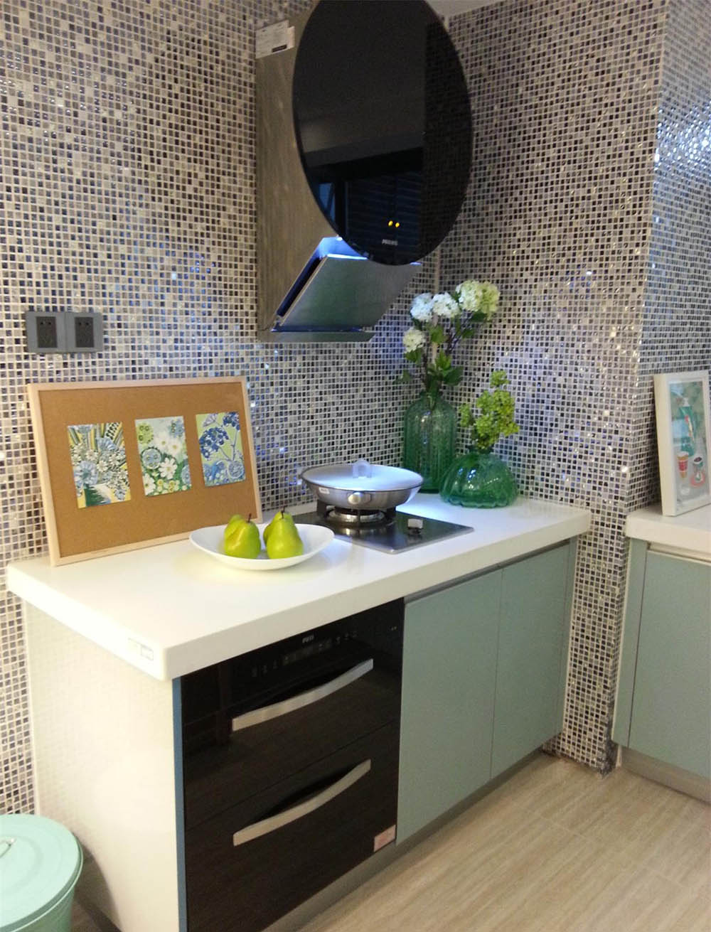 卫生间,依然马赛克砖上墙,可以看出户主对马赛克砖是真爱,因为厨房面积不大,所以橱柜面积也很小,不过一个人住,也不用担心不够用。